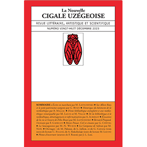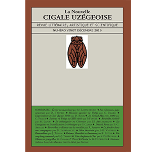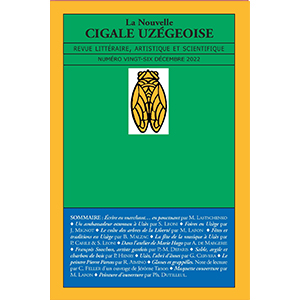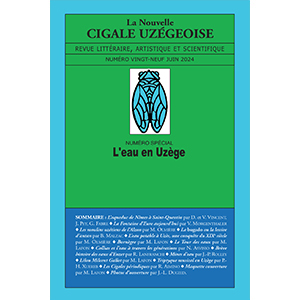 Édito de Christian Feller (président de l'association Les Amis de la Nouvelle Cigale Uzégeoise) : La cigale uzégeoise, une merveilleuse petite revue « scientifique et littéraire » chanta en Uzès et Uzège des années 1926 à 1934, date à laquelle elle s’endormit. Après ce long hivernage, elle s’éveille au XXIe siècle avec le même esprit, mais avec des coloris différents adaptés à son nouvel été. La Nouvelle Cigale Uzégeoise est littéraire, artistique et scientifique. Avec deux numéros par an d’environ 72 pages, elle vous présentera systématiquement ces trois rubriques, mais aussibien d’autres, comme des clins d’oeil à sa célèbre aïeule, une… En savoir plus
