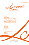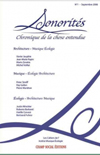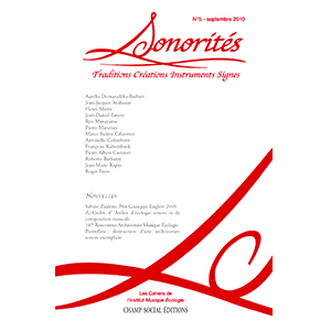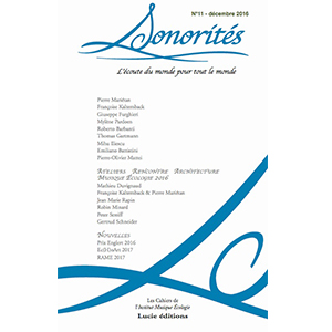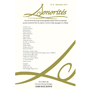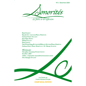 Présentation du numéro : La revue SONORITÉS veut rassembler les travaux, recherches, expérimentations, réalisations faisant état de la situation sonore de notre environnement. Publié à l’occasion du Congrès Mondial d’Écologie Sonore #2 (17-25 août 2012, Saline Royale d’Arc et Senans / Site Unesco, Doubs, France et Saillon / Valais, Suisse), ce numéro de Sonorités entend apporter une contribution significative au débat actuellement en cours autour de cette problématique fondamentale. Architectes, compositeurs, sociologues, musicologues, acousticiens, écologues et théoriciens formulent ici le cadre et les lignes directrices d’une réflexion sur l’écologie… En savoir plus